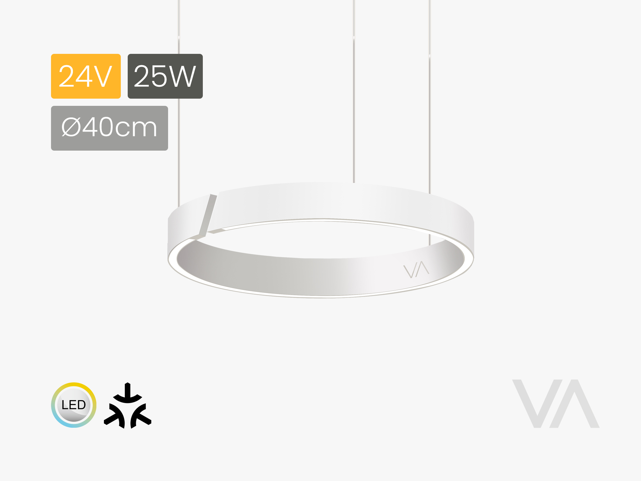 Light control: VoxAura app, VoxAura remote control, voice control via matter (Apple Home, Google Home & Amazon Alexa, …), wall plug (only on / off). Light functions: downlight, ambient lighting, dimming, multihwite 2700 / 3000 / 4000 / 5000 K, fading, memory function after restart. Application area: living room, dining room, kitchen island, reception (above tables). Signal range: Remote control to room light: 6 m. Room light in Thread mesh: 10-30 m. The light has an integrated power supply unit that transforms the voltage from 230 V AC to 24 V DC. However, the connection is made directly to the 230 V mains, which is why the connection may only be made by a qualified electrician.