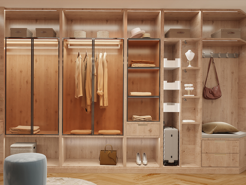 Clear, daylight-like light creates an overview and gives the dressing room a luxurious feeling of space. Integrated lights in shelves and drawers bathe every shelf in uniform light – for maximum order and true-to-life colour rendering when styling. Spotlights set specific accents and structure the room. The balanced lighting eliminates shadows, precisely illuminates every corner and combines functionality with glamour. The lighting concept emphasizes symmetry, structure and elegance – for special occasions and the perfect appearance in everyday life.