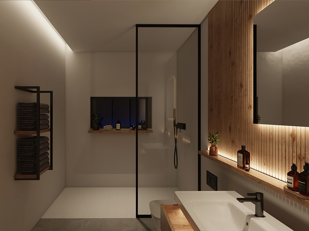 Soft, warm light along vertical lines gives the room structure and depth. Cleverly placed light zones highlight functional areas and at the same time create an atmosphere of calm and relaxation. In combination with natural materials and a minimalistic design, a modern bathroom with spa character is created. The harmonious lighting sets accents without imposing itself – ideal for a refreshing start to the day or a relaxing end to the evening.