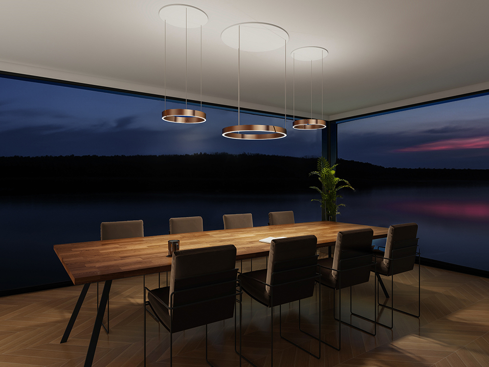 Filigree pendant lights in varying sizes and heights showcase the dining table as a central design element and at the same time create a sense of lightness and depth. Their purist design blends discreetly into the room concept and yet is a shining eye-catcher. The glare-free, dimmable light adapts to any mood. The dining table thus becomes the centerpiece of the get-together, functionally illuminated, atmospherically staged – a warm setting for shared dinners, lively conversations or quiet moments with a glass of wine.