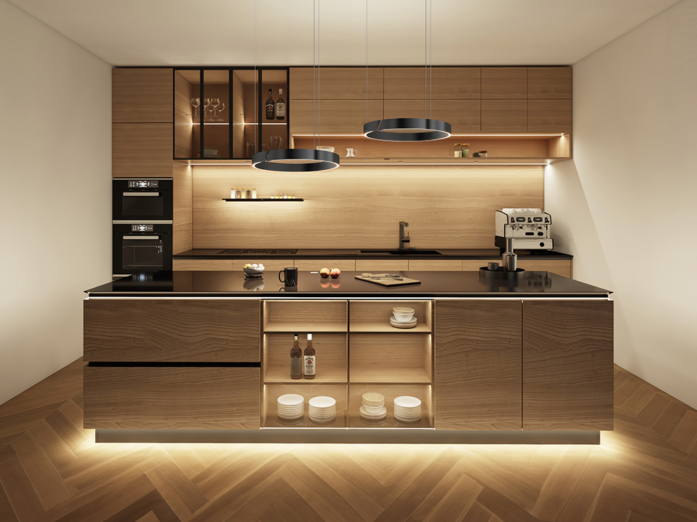 The minimalist design of the sophisticated lighting blends seamlessly into the Scandinavian-influenced aesthetic of the kitchen, allowing materials, tones and textures to shine. Clear, glare-free light, smart controls and precise accents such as illuminated cabinets, shelves and drawers combine functionality with subtle elegance, while pendant, under-cabinet and plinth lights provide structure, lightness and an open feeling of space, adding depth to the room. Dimmable lights with variable colour temperature adapt to any situation. The result is a kitchen that harmoniously combines style, comfort and technology – ideal for everyday life, enjoyment and unique moments.