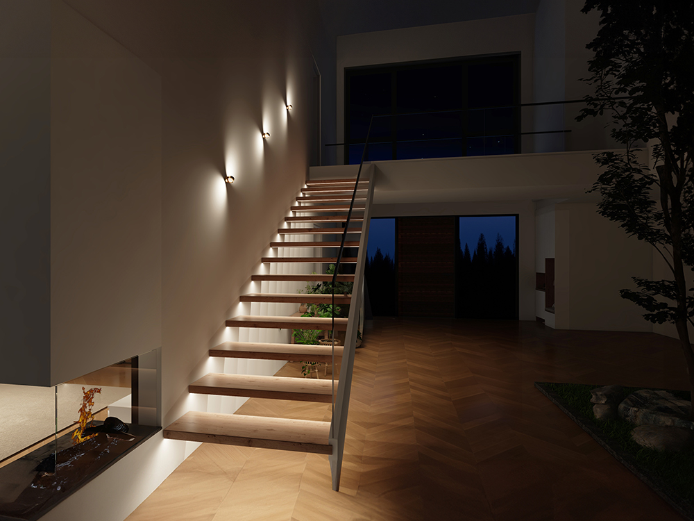 Warm white light creates an inviting atmosphere in the entrance area and set subtle accents along the architecture. Illuminated steps draw the eye upwards and emphasize the lines and depth of the room. Wall lights create a lively interplay of light and shadow, bringing movement and structure to the surface – perfect for hallways, stairs and modern wall design.